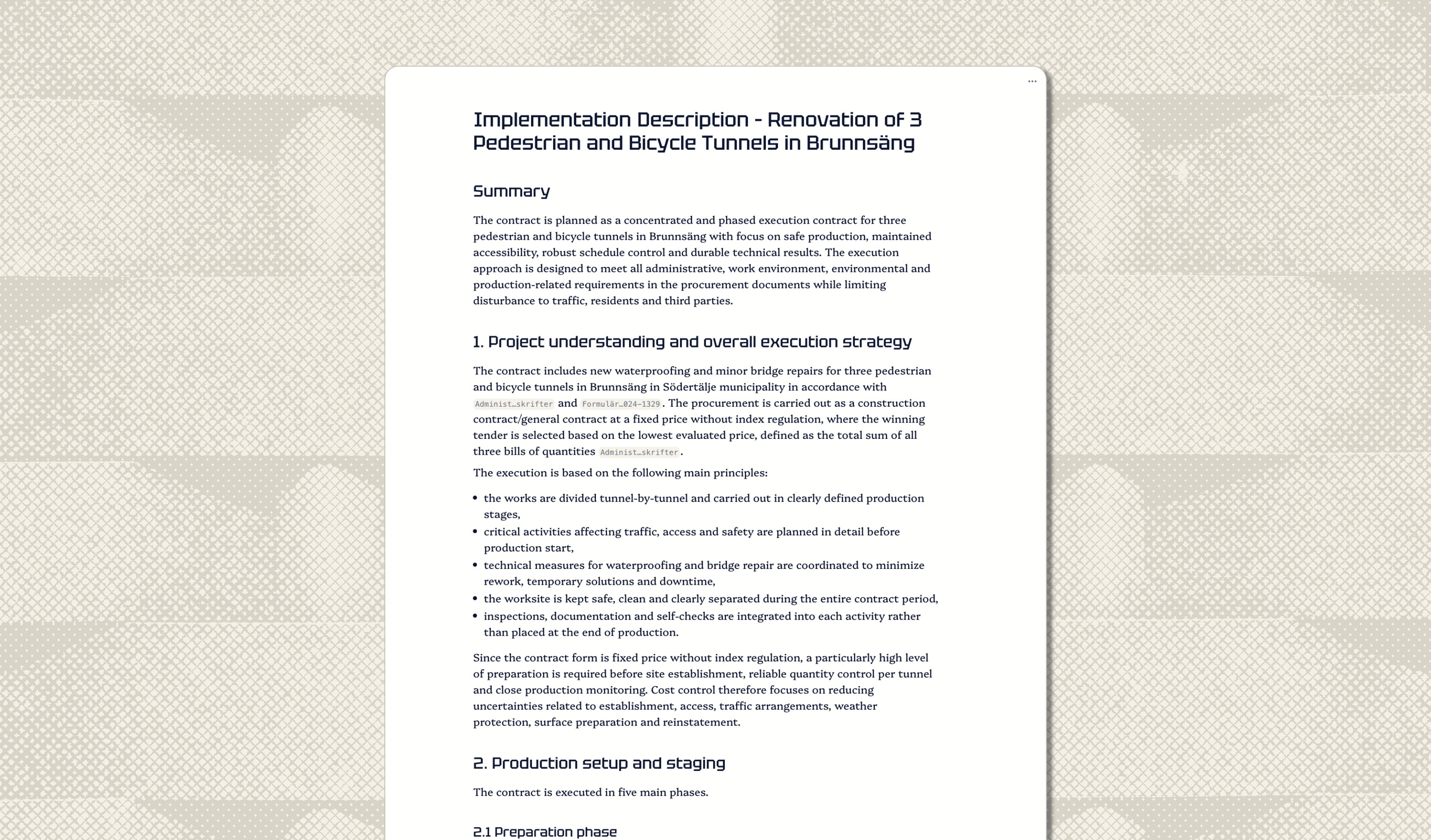 When bidding on a construction contract, the implementation description (genomförandebeskrivning) is often the document that decides whether you win or lose. It is also the most time-consuming to write. You need to read the evaluation criteria, understand the client's priorities, pull the right technical details from the tender documents, and weave it all into a cohesive, professional narrative. That process takes days. Sometimes weeks.